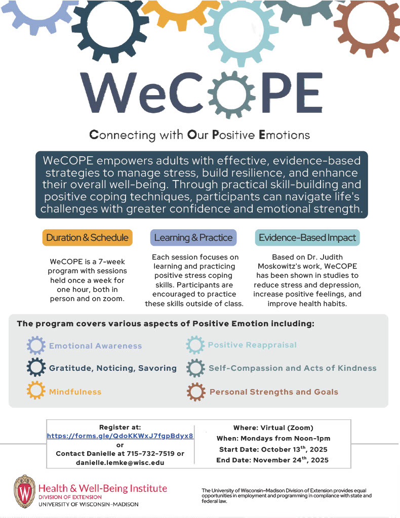 WeCOPE Connecting with Our Positive Emotions Program Being Offered Published on September 4, 2025 by NANCY SERVAIS WeCOPE is a 7-week program with sessions starting October 13th held both in-person and on Zoom. Registration needed.