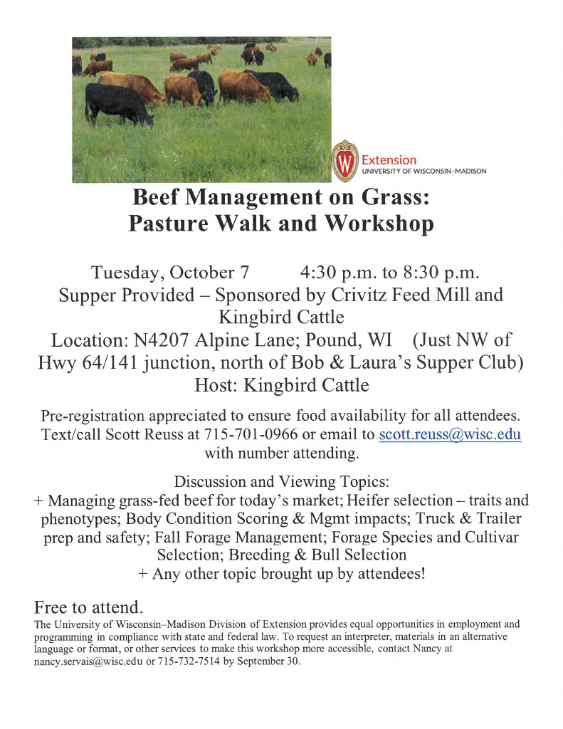 (Crivitz) Multiple aspects of properly managing beef in a rotational grazing management system will be featured as part of the discussions at a Pasture Walk & Workshop being held on Tuesday, October 7. The event is being hosted by Kingbird Cattle in the Town of Beaver, located at N4207 Alpine Lane. The event is collaboratively sponsored by Kingbird Cattle, Crivitz Feed Mill, and UW-Madison, Division of Extension.