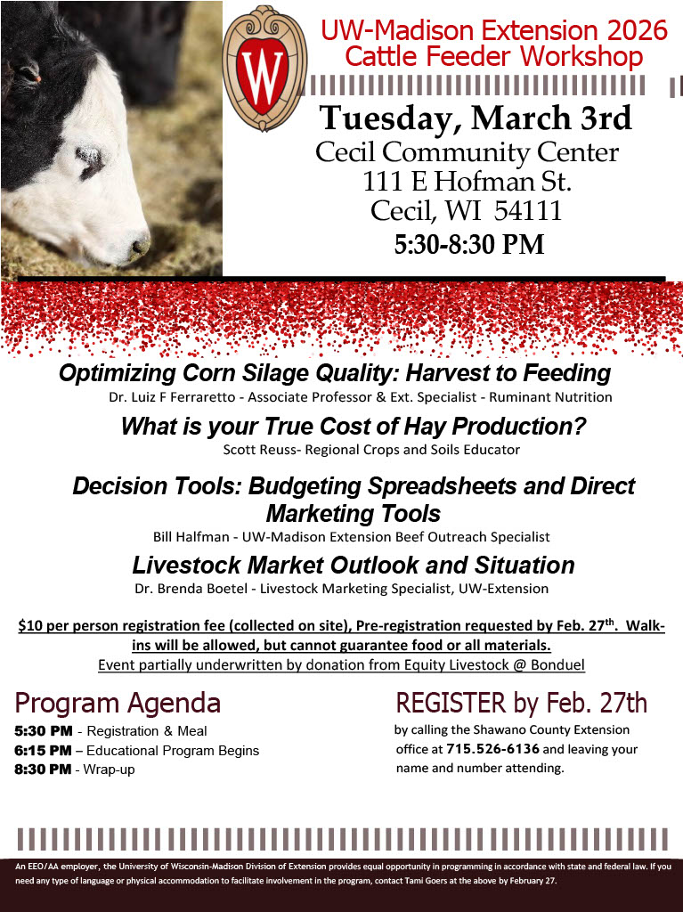 The workshop will be held at the Cecil Community Center, 111 E. Hofman St, Cecil, WI beginning at 5:30 p.m. with registration and meal, with the educational topics beginning at 6:15 and program completion approximately 8:30 p.m. There is a $10 per person registration fee that will be collected on-site, but pre-registration is required by February 27 by contacting Tami at the Shawano County Extension Office, 715-526-6136 or emailing tami.goers@wisc.edu Questions and registration can also be directed to Reuss at 715-701-0966 (text/call) or email to scott.reuss@wisc.edu
